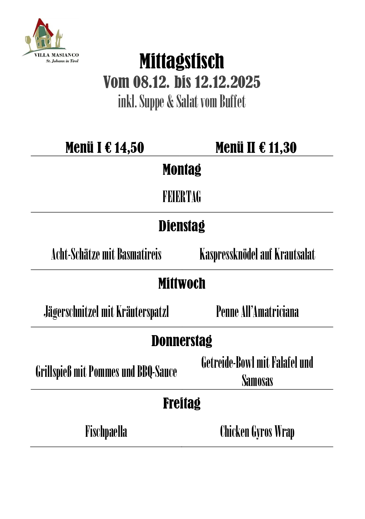 Wir bieten unseren Gästen an Wochentagen ein Mittagsmenü zur Auswahl mit Suppe und Salat vom Buffet zum Selbernehmen. Speziell für alle Berufstätigen, die mittags wenig Zeit haben und doch "was Gscheites" essen möchten, empfehlen wir diese Varianten zum erschwinglichen Preis.